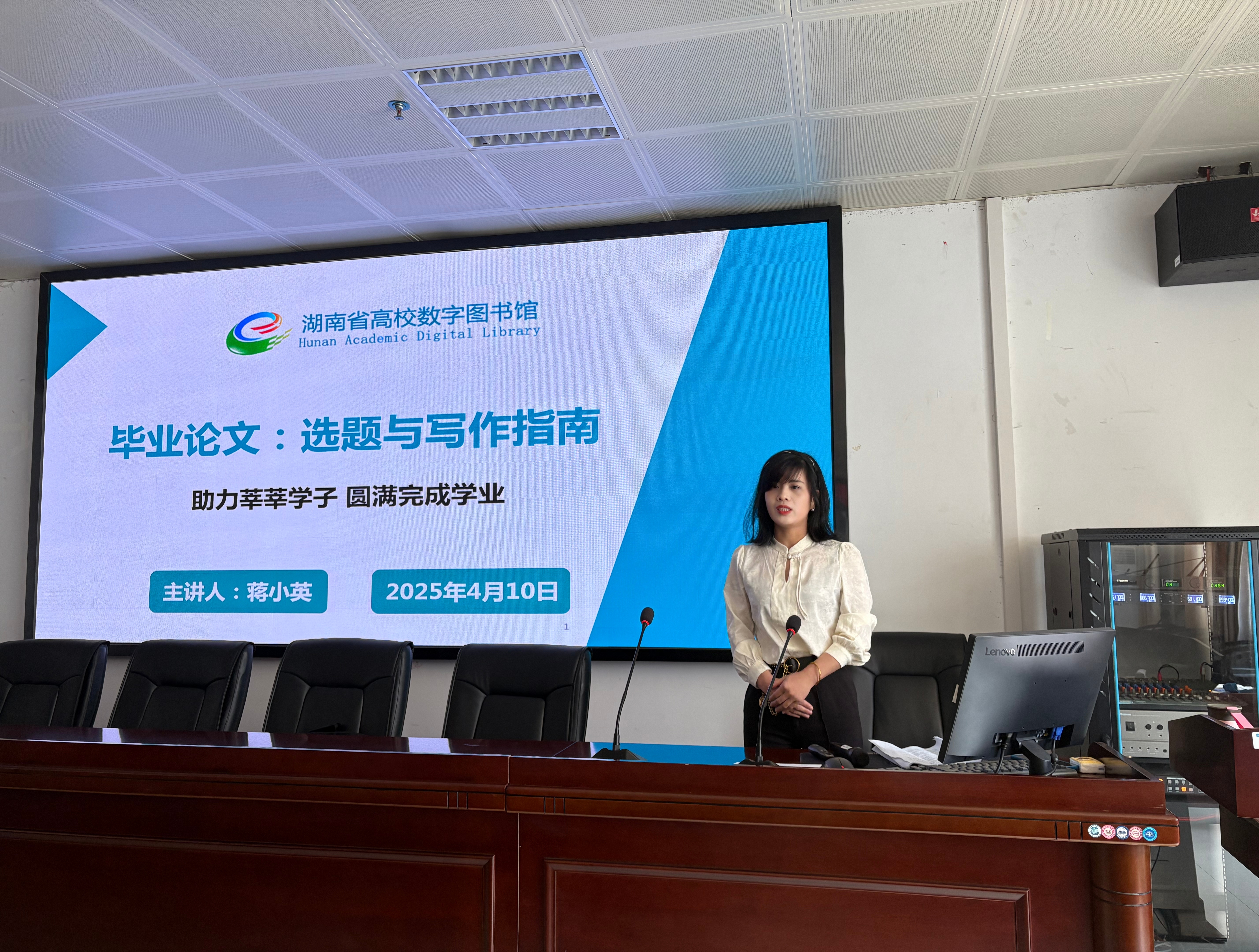 为深化湖南省高校数字图书馆资源共建共享服务,助力省内高校学子提升学术研究能力,2025年4月10日,我校图书馆馆员、湖南省高校数字图书馆讲师团成员蒋小英受邀赴湖南人文科技学院开展“毕业论文:选题与写作指南”专题讲座。本次活动是我校图书馆参与湖南省高数图2025年度资源建设与信息素养教育活动的重要一环,吸引了湖南人文科技学院200余名师生参与。