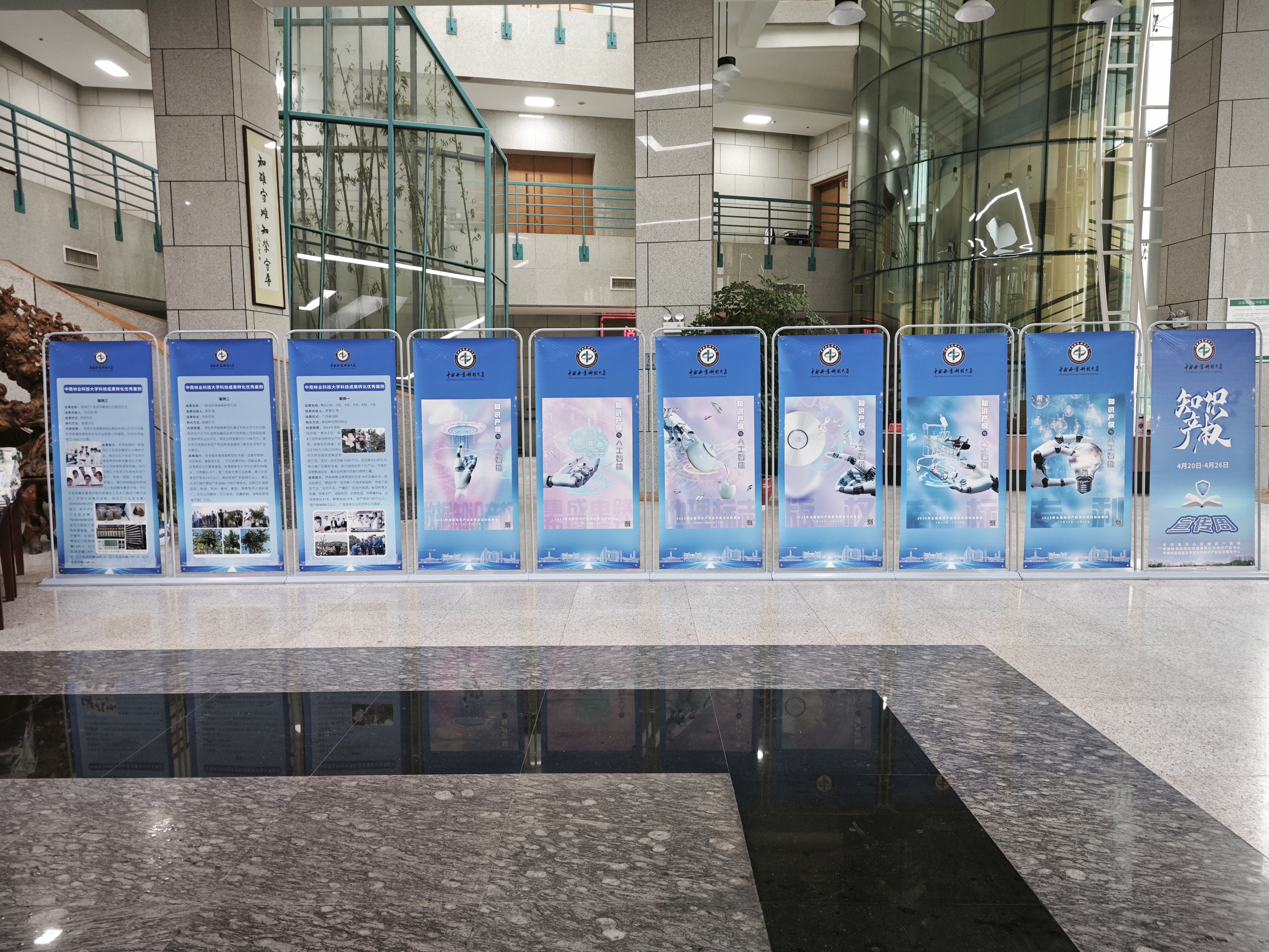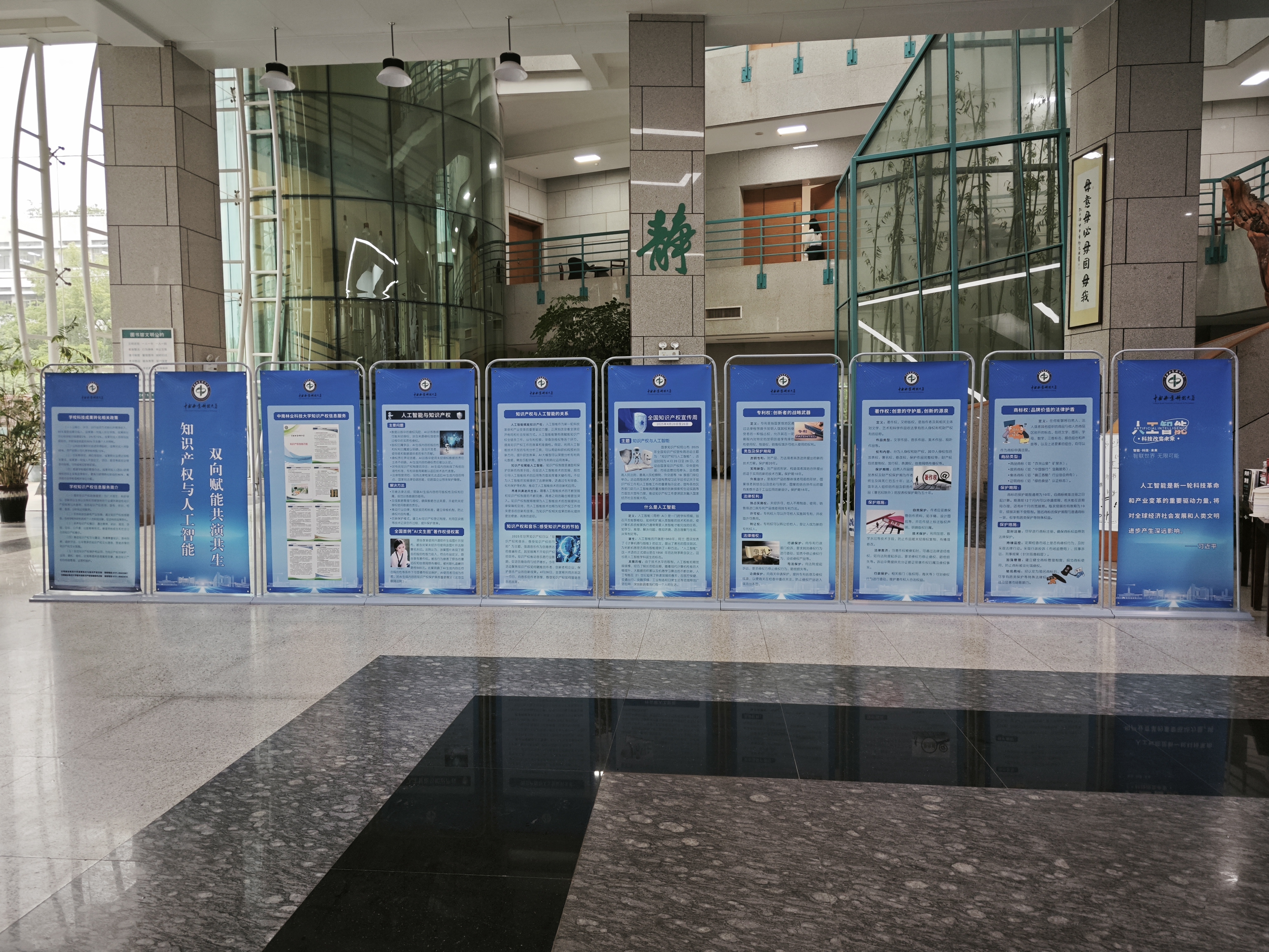 知识产权宣传展板于崇德楼、图书馆大厅,展示主题、法规政策、成果、案例,激发师生对知识产权的兴趣和重视。