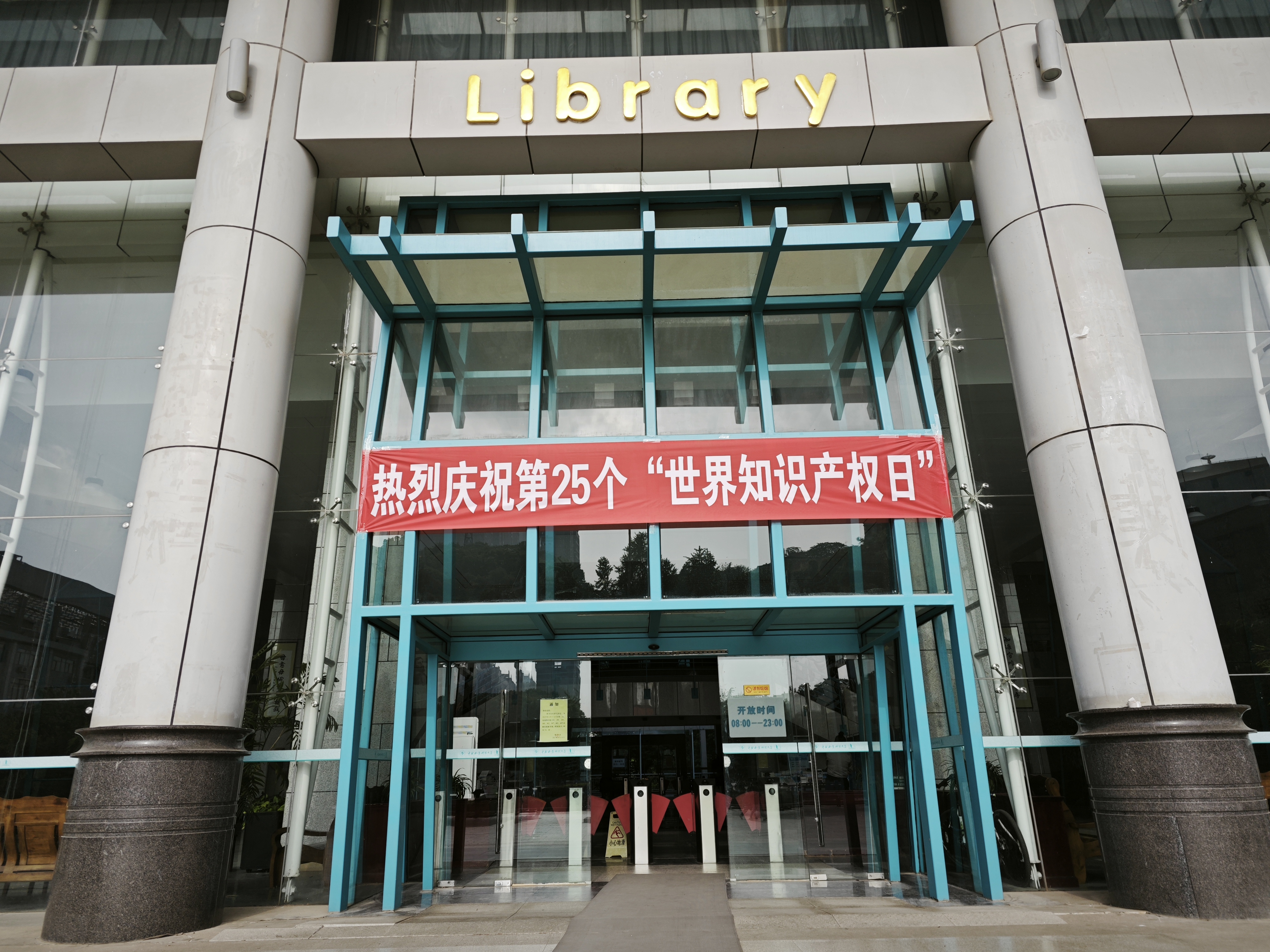 在东西馆悬挂知识产权日横幅,营造氛围,吸引关注,提升师生重视知识产权保护。