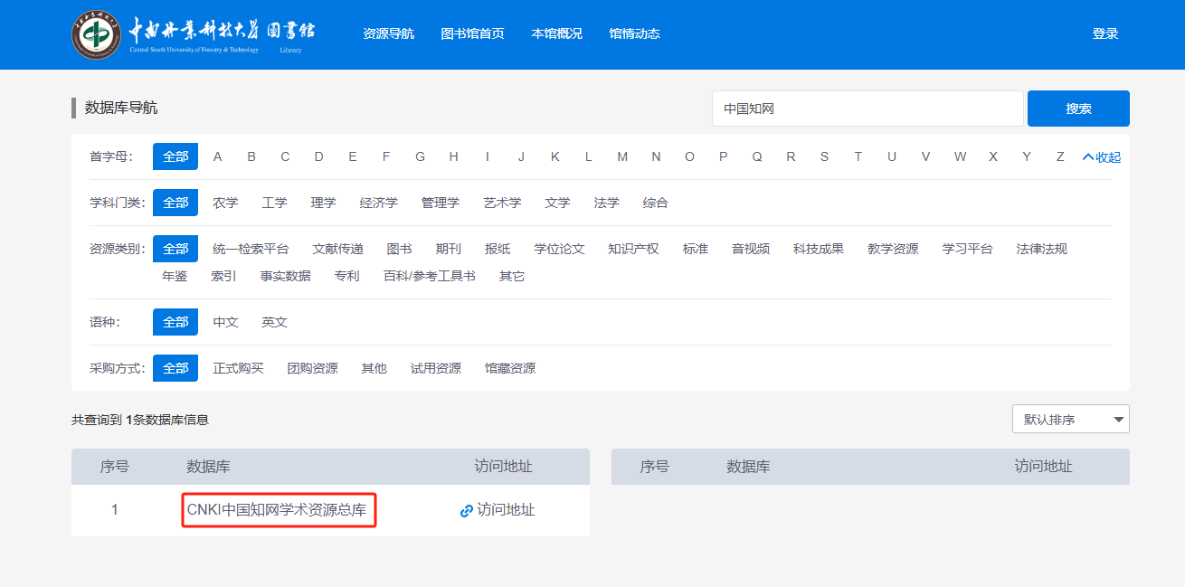 2.在搜索框输入数据库名称(如“中国知网”);