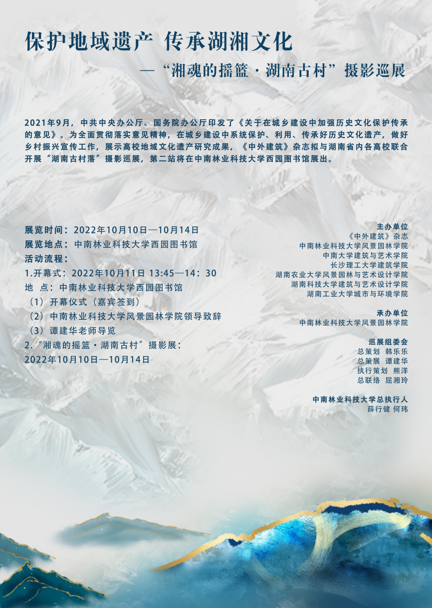 为宣传乡村振兴,展示地域文化,10月10日,我校风景园林学院与湖南省内各高校联合举办的“湘魂的摇篮·湖南古村”摄影巡展暨“地域文化遗产”系列研讨会在图书馆西馆成功举办。